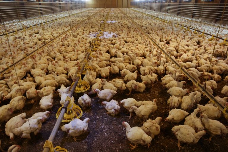 plofkippen worden met veel te veel dieren bij elkaar in een stal gepropt.